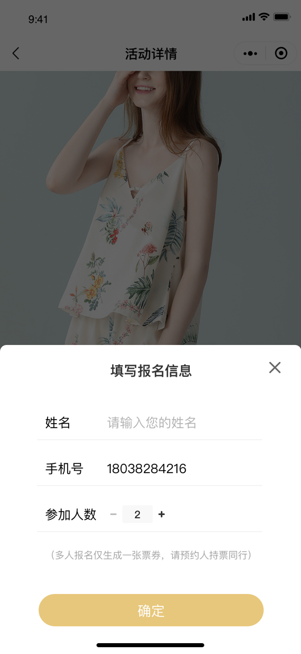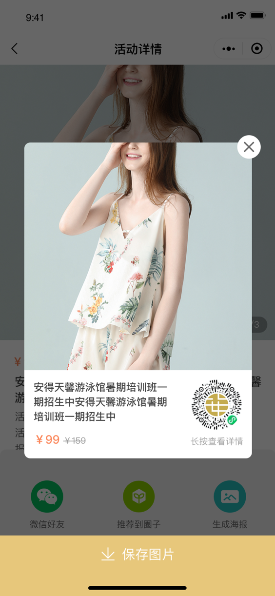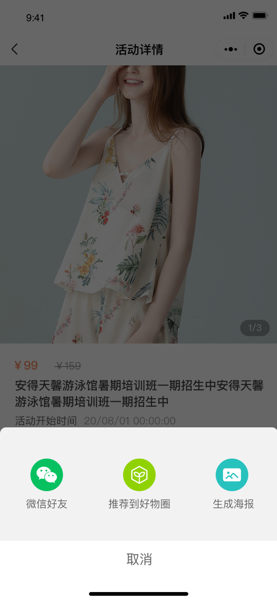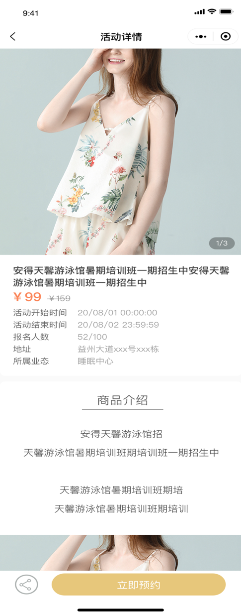 活动详情页包含封面展示、活动名称、地点、时间、活动介绍图文展示、预约、分享、支付等