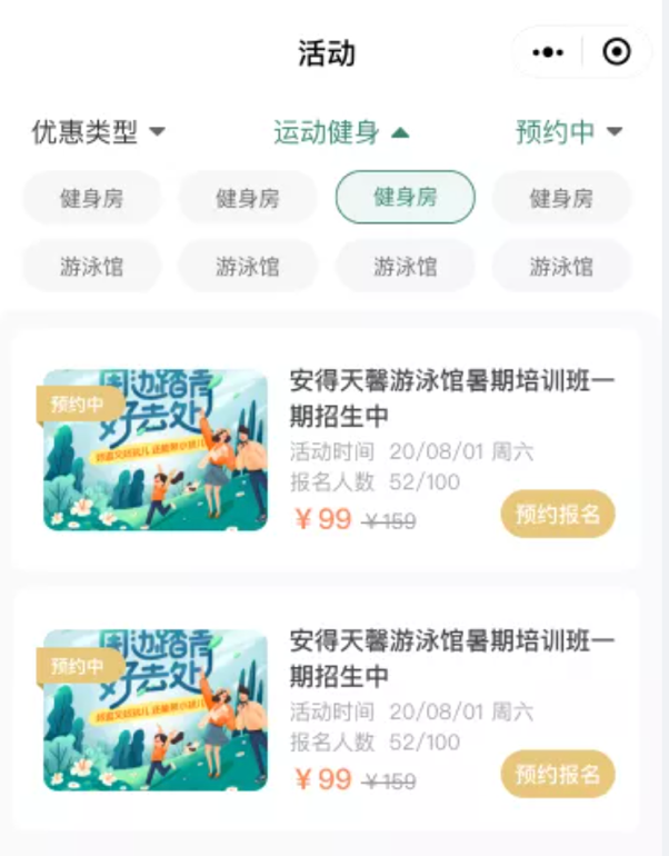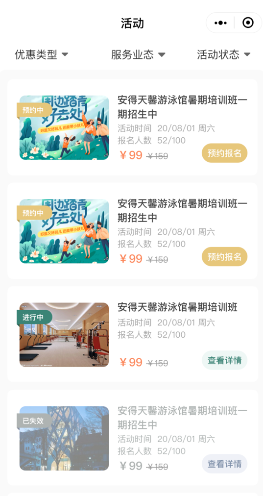 活动列表页主要包含活动的名称、报名人时间、活动状态等。可根据优惠类型、服务业态、活动状态进行筛选