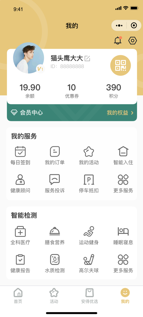 主要展示用户信息、消息提醒、设置、余额查看、积分查看、我的服务、智能检测等。