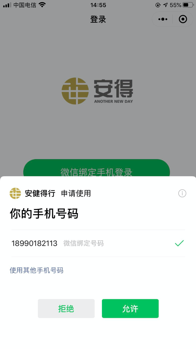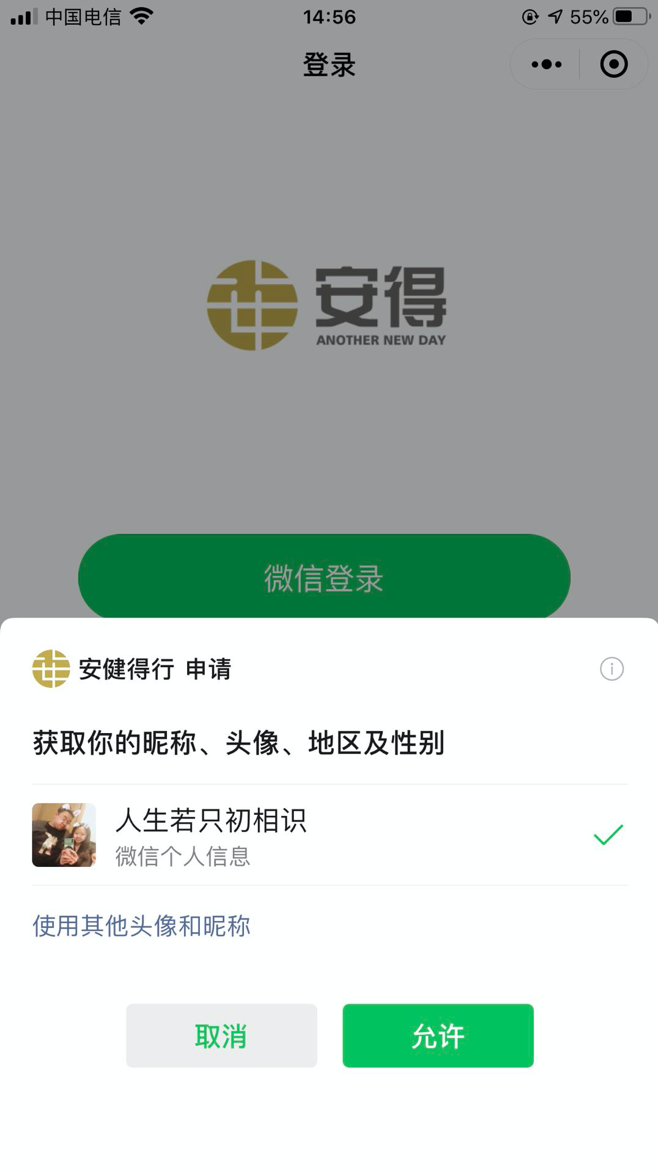 3、绑定微信信息授权,请您先点击“微信登录”,然后再弹出的授权窗口点击右侧“允许”按钮,小程序会自动拉取您的微信头像和OpenID。